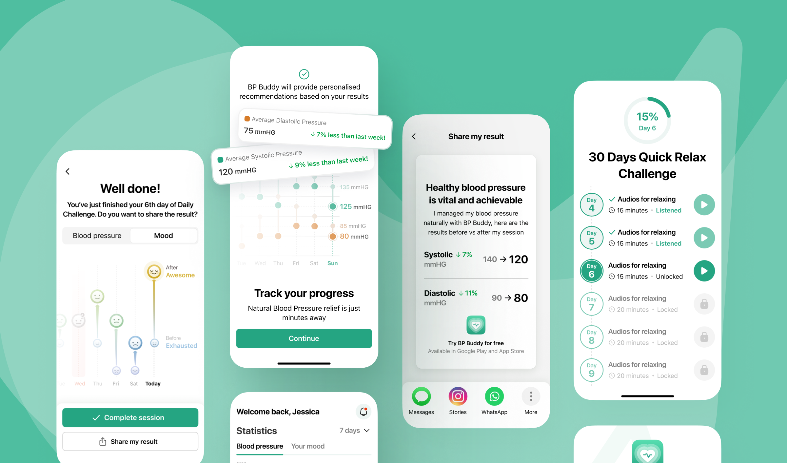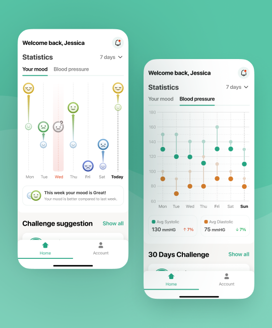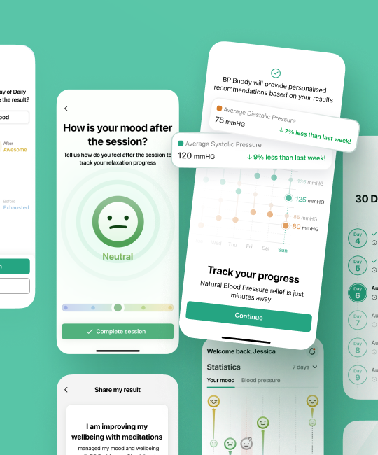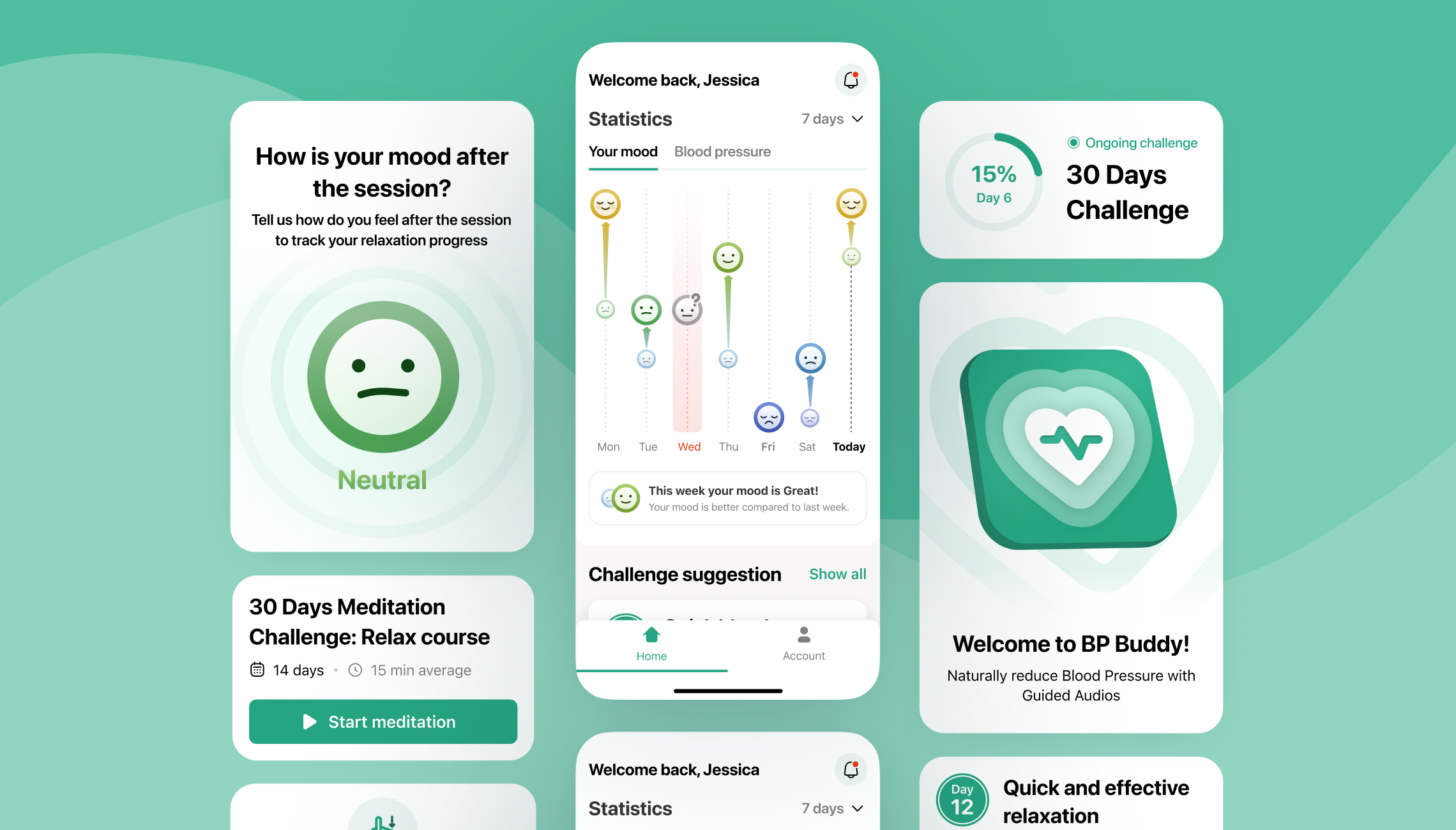 BP Buddy is a mobile health platform designed to bridge the gap between subjective feelings and clinical data. While most meditation apps rely solely on mood tracking, our client wanted to provide tangible proof of progress by measuring blood pressure alongside emotional states.