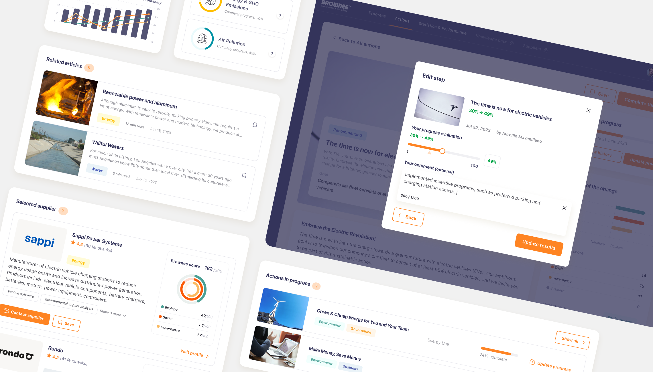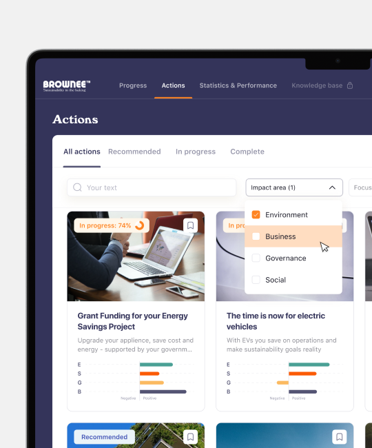 Brownee is a comprehensive B2B platform designed for companies committed to sustainable energy and global ESG (Environmental, Social, and Governance) standards. Many organizations struggle to translate vague sustainability goals into actionable strategies. Our task was to design an end-to-end digital ecosystem that assesses a company's current state, suggests high-impact tasks, and tracks real-time progress.